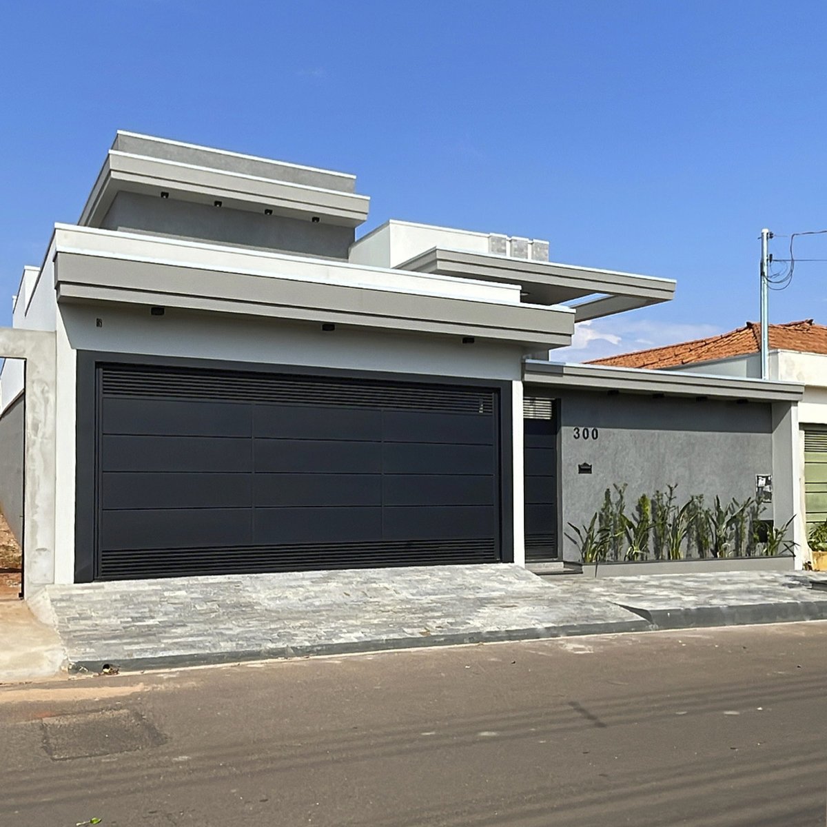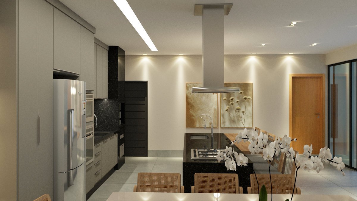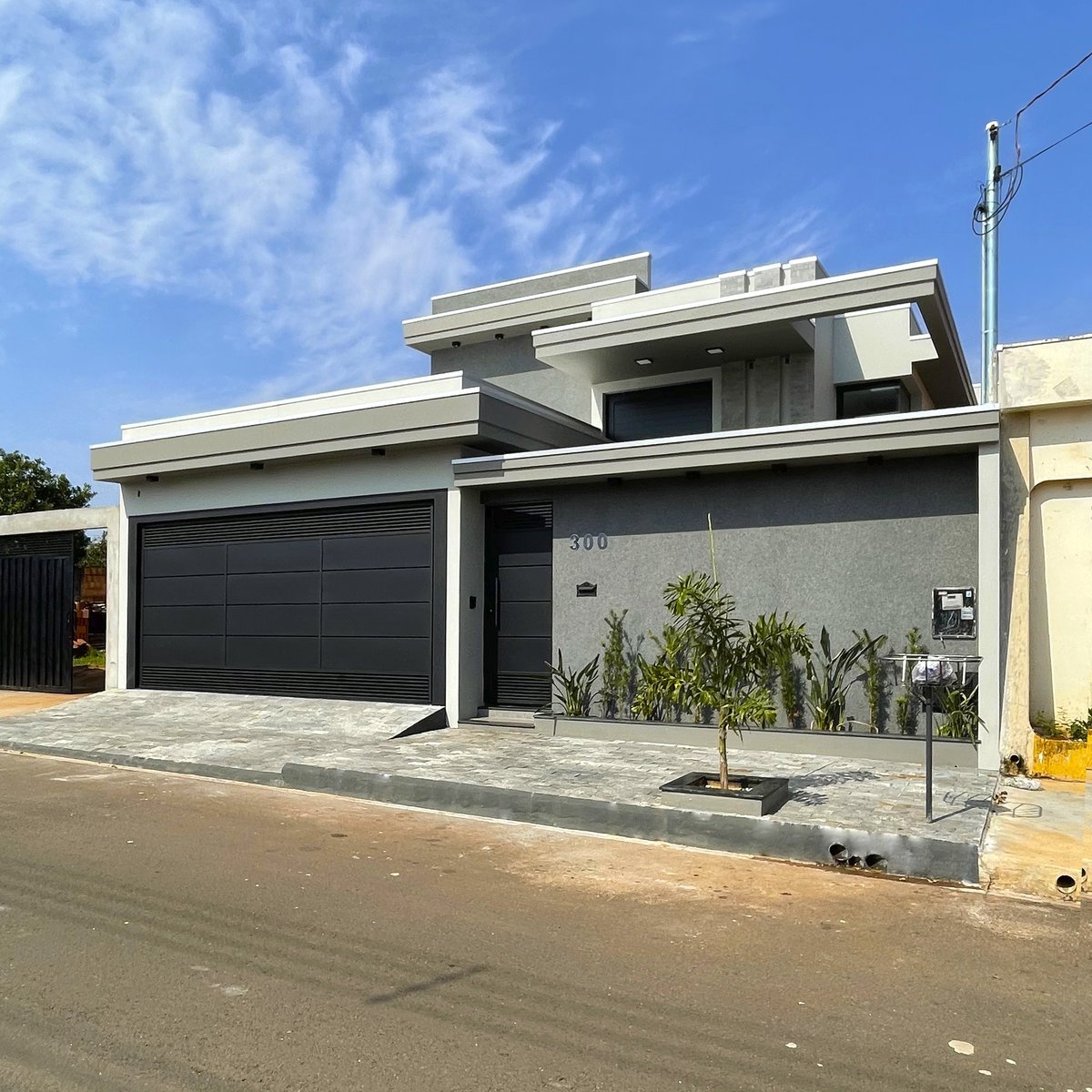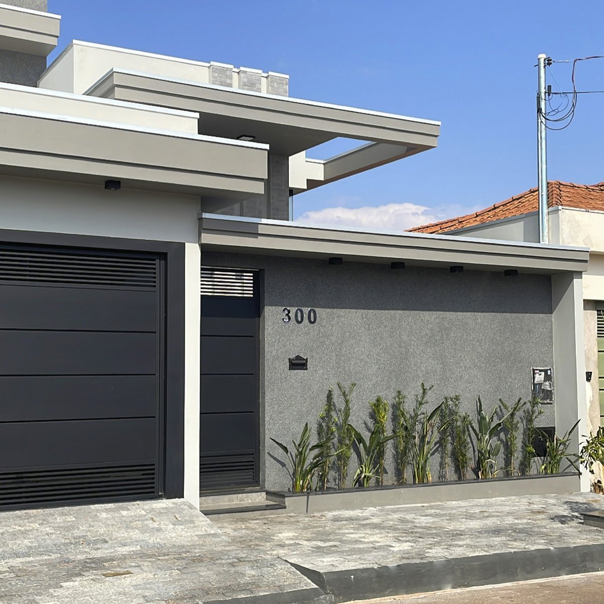Este projeto apresenta uma fachada contemporânea de linhas retas e volumetrias marcantes. A paleta neutra em tons de cinza e preto garante sofisticação e atemporalidade.