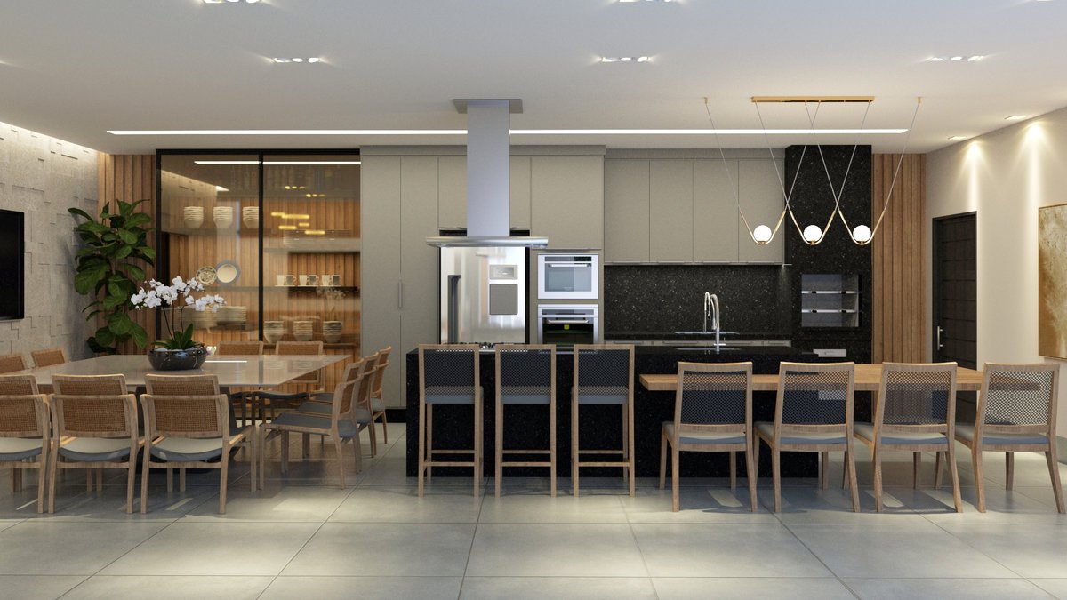 Na parte interna, a área social foi pensada para promover integração total entre sala de estar, cozinha e jantar, criando um espaço amplo, iluminado e acolhedor. Os acabamentos em madeira, pedras escuras e iluminação estratégica trazem equilíbrio entre aconchego e modernidade.