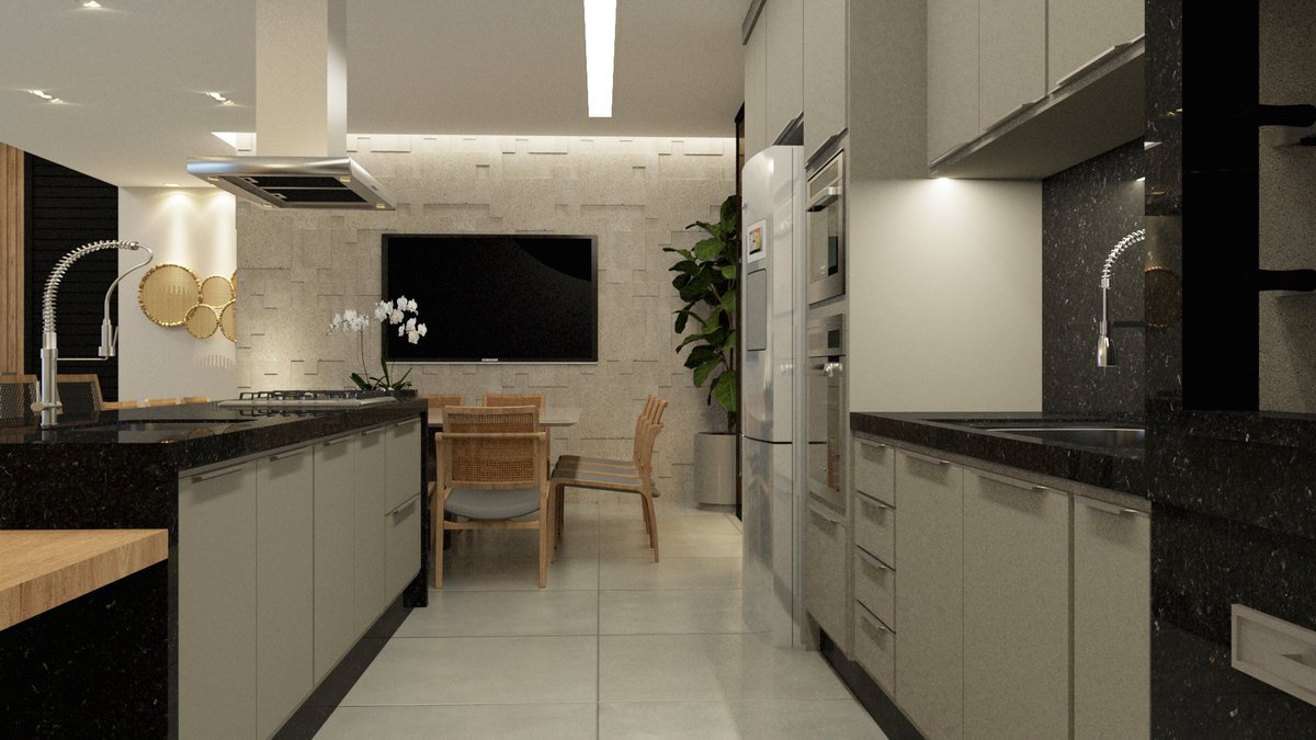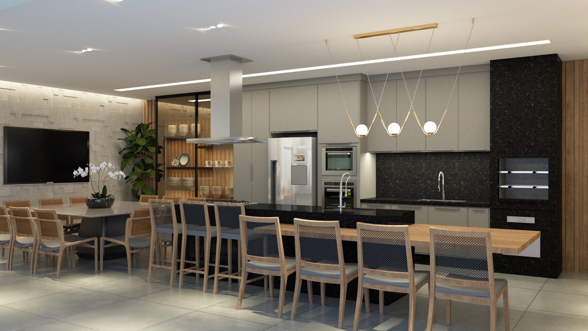 O ambiente gourmet é um dos destaques do projeto. A ilha central e os generosos espaços de bancada tornam a cozinha não apenas funcional, mas também perfeita para receber amigos e familiares. A marcenaria sob medida garante organização e elegância, com um toque acolhedor trazido pelas cadeiras em palhinha natural.