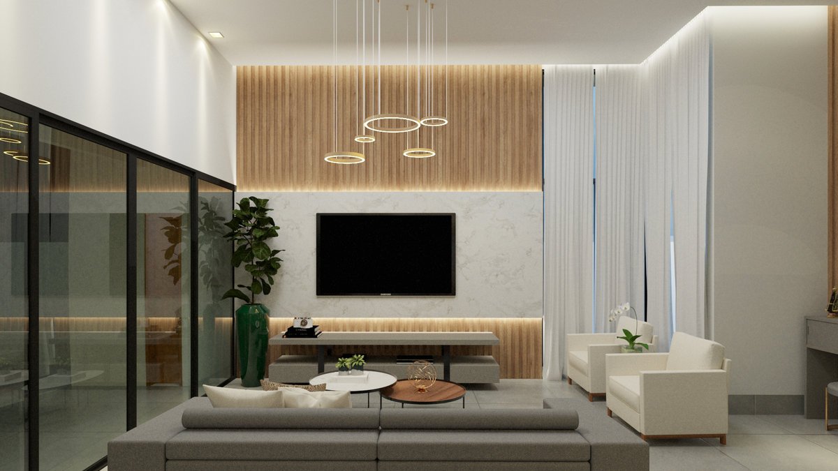 Na sala de estar, o painel ripado em madeira com iluminação embutida emoldura a TV, criando um ponto focal elegante. O mobiliário em tons neutros e a iluminação pendente com design orgânico complementam o espaço com charme e conforto visual.