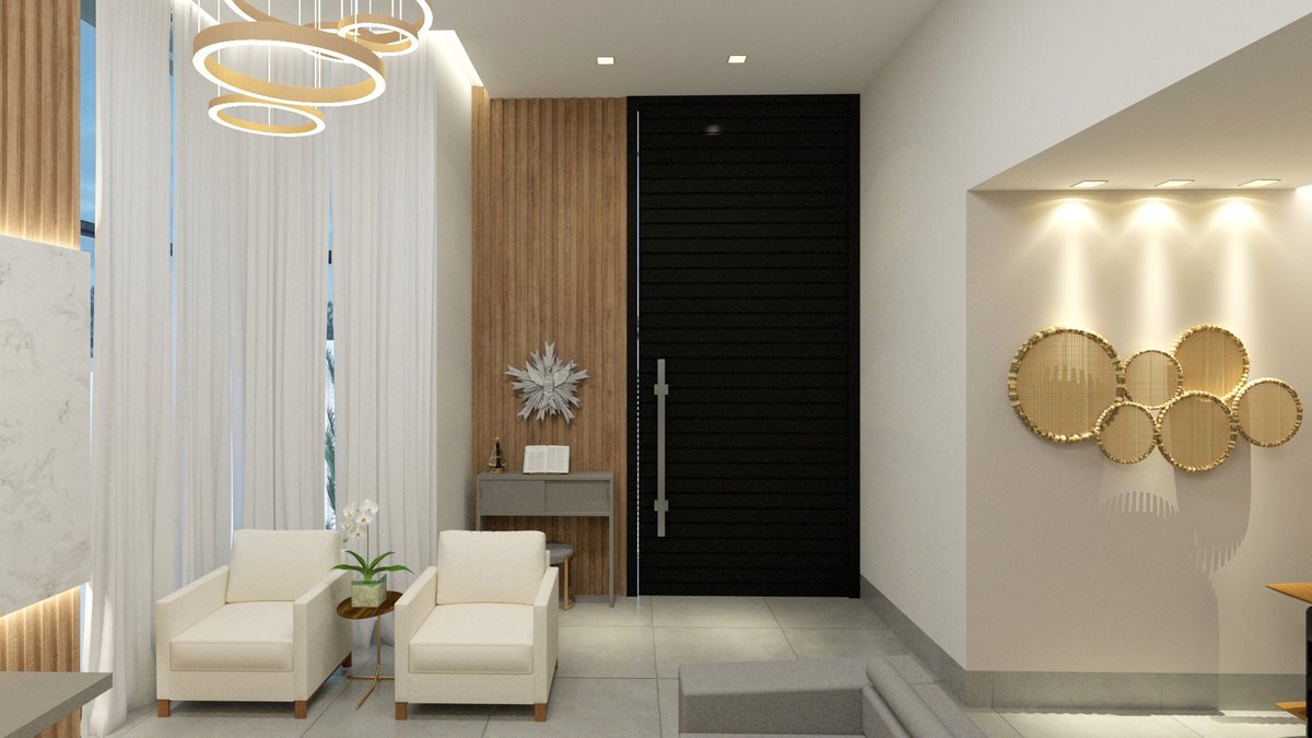 O hall de entrada conta com uma porta pivotante de destaque e um oratório. O resultado é uma recepção acolhedora e sofisticada, que antecipa a linguagem contemporânea adotada em todo o projeto.